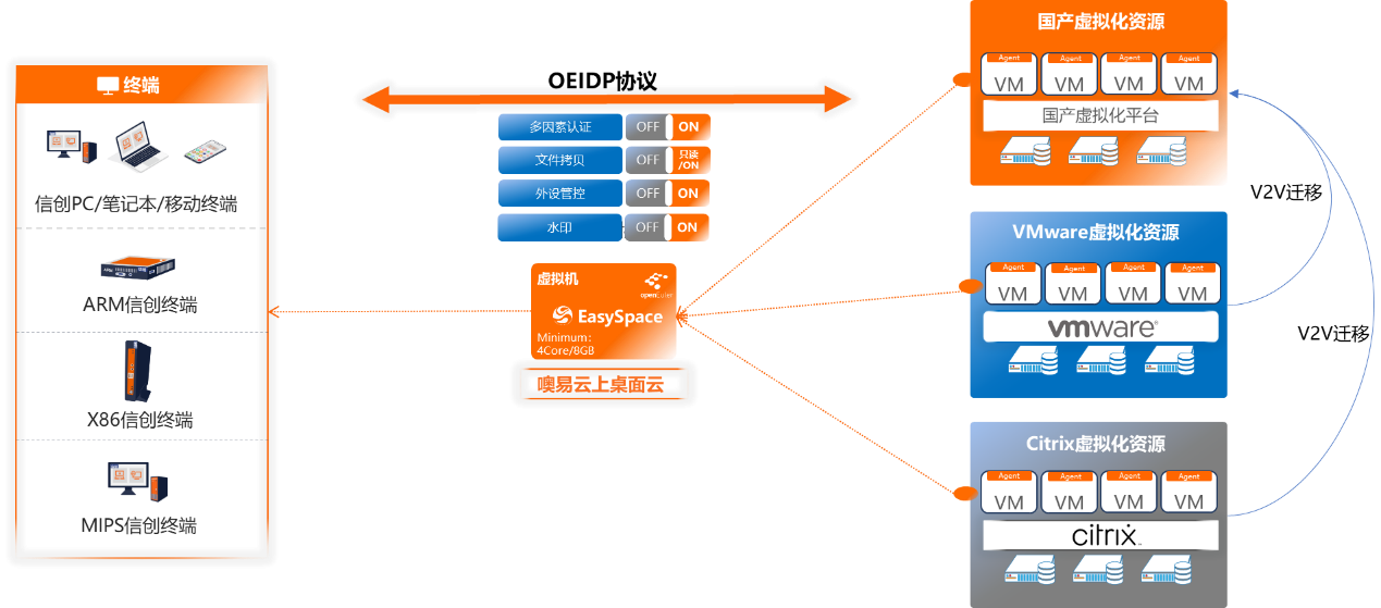 后续如需将相关桌面迁移至国产的虚拟化集群,那么只需在后端虚拟化集群中进行V2V迁移,所有的迁移工作仅在后端虚拟化集群之间执行,对前端普通员工无感。