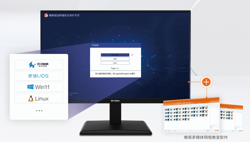 华为擎云PC构建的计算机教室提供国产操作系统/Windows操作系统双系统的统一部署功能,并可以实现系统保护、桌面数据还原、多系统切换与桌面操作行为管控等功能。