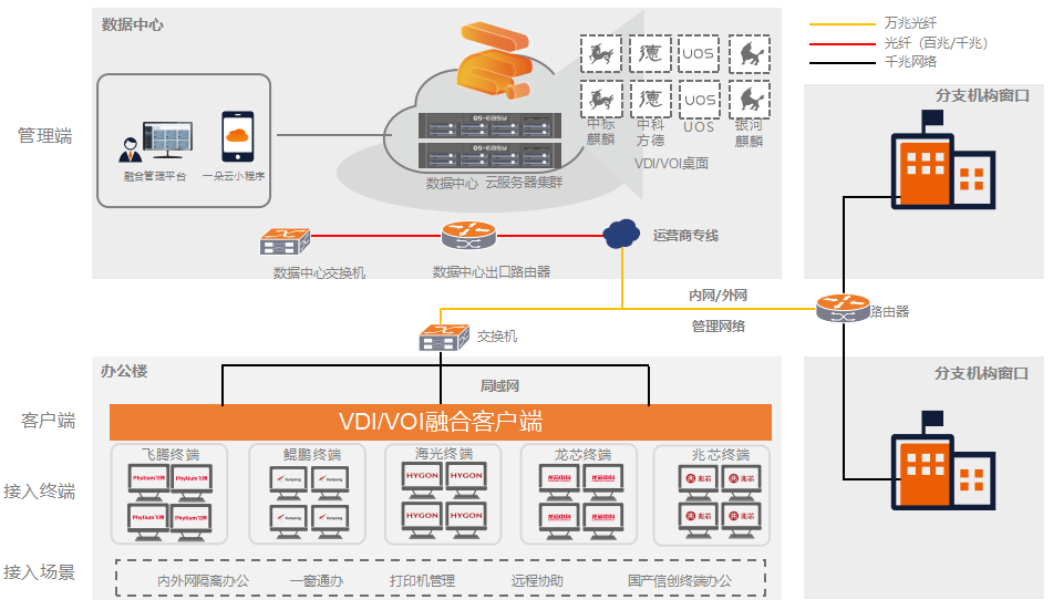 针对窗口办公场景终端分散的现状,噢易云PC系统依托IDV/VOI桌面架构,为客户提供创新二层架构,跨互联网集中化管理桌面环境、分散终端集中管理、办公环境集中部署、离线桌面持续使用、远程管理、高效的应急处理预案,极大降低管理难度,为客户带来诸多价值。