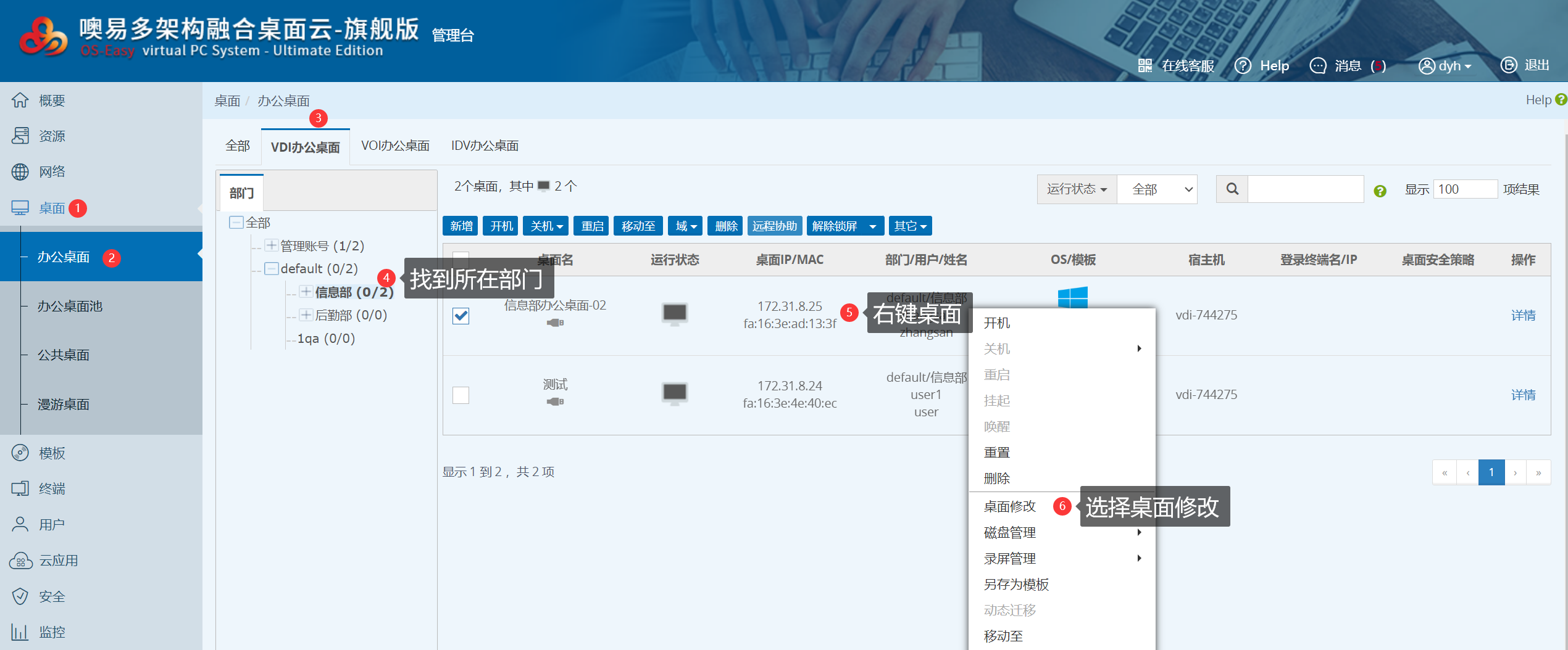 1、登录管理平台,选择[桌面]-->[办公桌面]-->[VDI办公桌面]-->选择[部门]-->右键桌面-->[桌面修改],如下图: