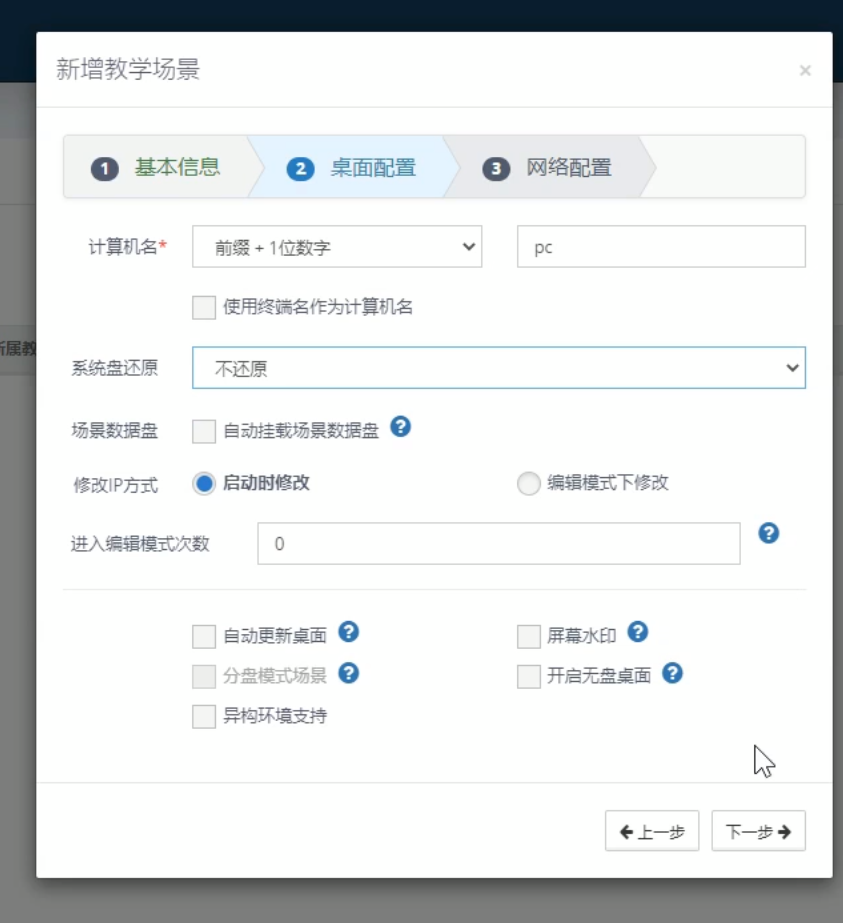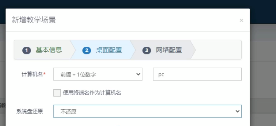2.输入场景名称,选择教室,按需求选择一个已创建好的教学模板进行创建桌面,选择完成后点击下一步