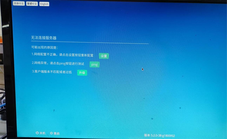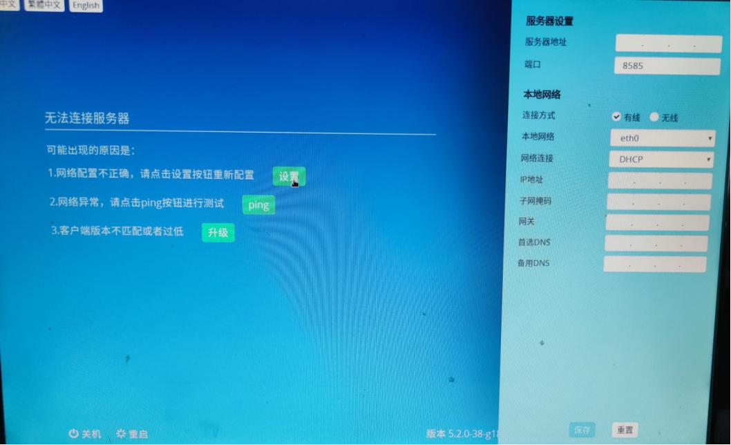 9.重启后,出现以下画面,点击设置,填入服务器的IP,网络连接选择手动,IP地址填入原地址即可,可以在管理平台上查看,或者打开左边右边的终端设置看下,推测下这台终端的IP,掩码、网关、DNS跟其他终端一致即可。