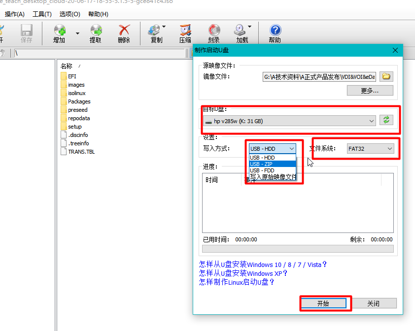 6.然后选择你的U盘,写入方式选择USB-HDD,文件系统选择FAT32,点击开始,等待进度条走完,显示完成后U盘就做好了,点击关闭,退出U盘。