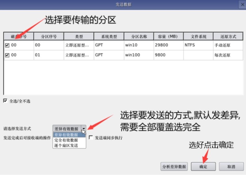 ⑤参数发送完毕后,就进入到数据发送操作了,点击【发送数据】,对需要发送的分区进行选定。