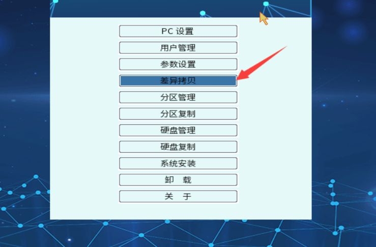①底层进入:开机后在OSS底层系统选择界面,按“F10”键,输入管理员账号和密码(默认账号为sys,密码为空),然后选到“差异拷贝”,按回车进入。
