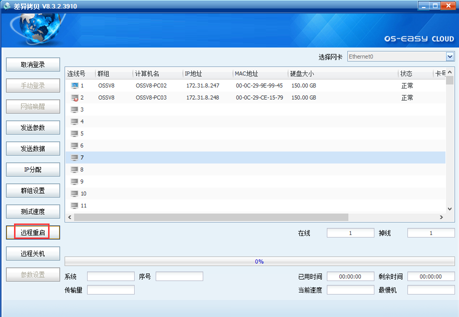 说明:勾选要同传的数据盘,选择差异有效数据(默认差异有效数据,一般就选择默认的即可),对机器的操作建议勾选 “无”,然后点击确定,直至发送端数据发送完成后,执行“远程重启”即可。