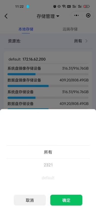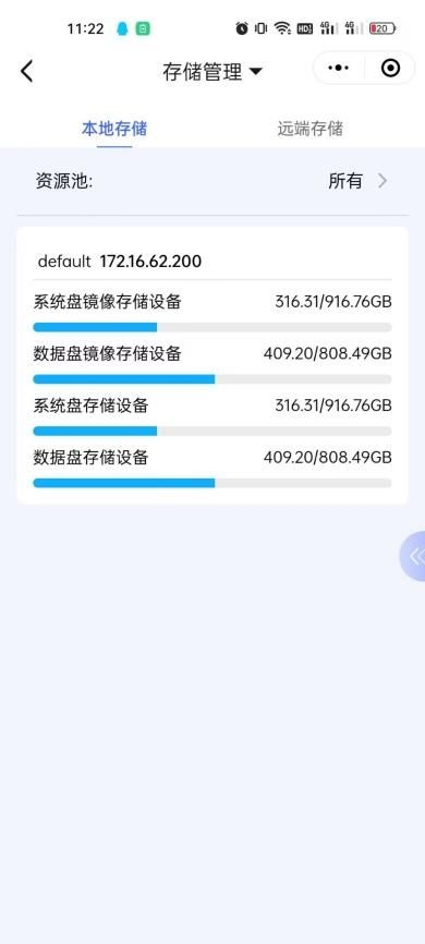 1、进入小程序后,点击『功能台』→【资源】界面,点击顶部切换【存储管理】→【本地存储】页面;可点击右侧展开弹窗,选择其他资源池,查看存储使用详情;