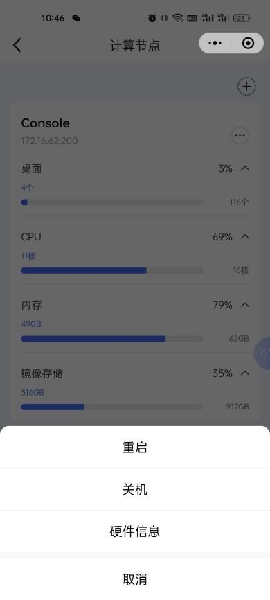 2、点击资源池,进入其下的计算节点界面;点击【更多】,展开【重启】、【关机】、【硬件信息】按钮;