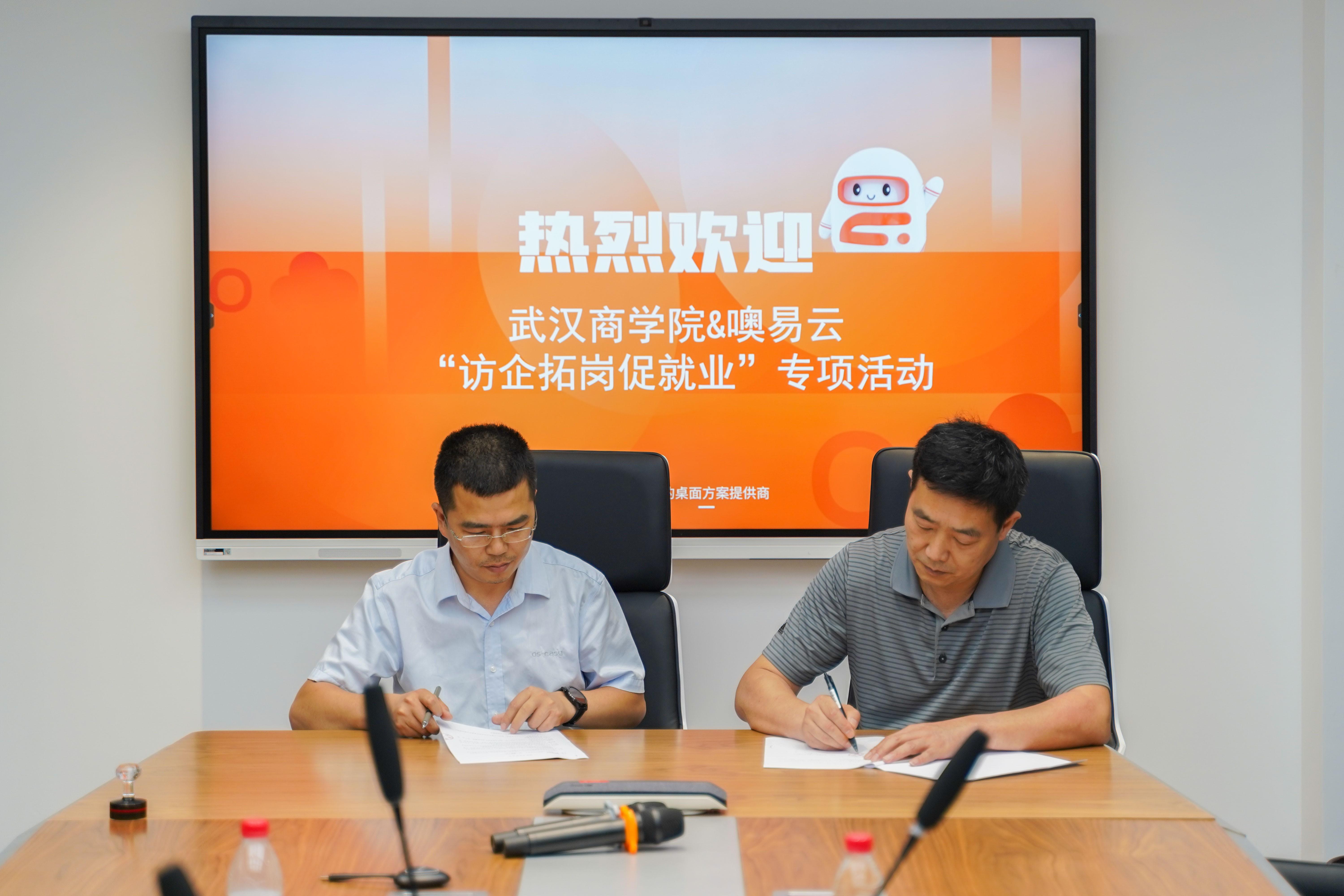 同时,噢易云与武汉商学院举行了隆重的产学研合作签约仪式,正式签署实习就业基地协议,并进行授牌仪式。双方围绕“访企拓岗促就业”专项活动,进行资源共享、优势互补、互惠互赢、共同发展。随着此次协议的签订,校企合作再升级,双方将在人才培养与技术培训、共建满足人才培养要求的实践教学基地、本科人才就业合作、创新创业服务、共建实验室或工程中心等方面开展深度合作。