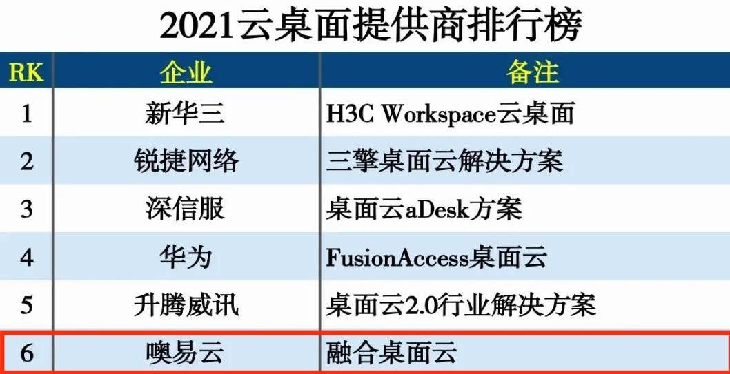 11月29日,互联网周刊、德本咨询、eNet研究院联合评选并发布“2021 云桌面提供商排行榜”, 噢易云凭借自身在 云桌面领域领先的行业理念、自主创新的产品技术和深度融合行业的优异市场表现,继2020年入选排行榜后,2021年再次入选“2021云桌面提供商排行榜”,位列榜单第六名。   2021云桌面提供商排行榜(图)   当前,数字化转型步伐不断加快,教育新基建战略的提出与落地实施, 信创产业已初步形成体系化、生态化发展态势,越来越多的需求被释放,助推了云计算及政府企业上云的发展浪潮。互联网周刊、德本咨询、eNet研究院作为中国互联网和IT业界主流和权威媒体之一,此次排行榜从用户角度出发,对云桌面领域内的相关对象进行全方位的综合评估,是业界权威的榜单之一,其专业性、客观性和权威性已被业界广泛认认可。   深耕教育行业,率先实现融合桌面云突破   武汉 噢易云计算股份有限公司成立于2013年,是专业的桌面云方案提供商,致力于通过云计算、桌面云服务、智能物联网、边缘计算等前沿技术的研发和技术创新,为教育、政府、企业、医疗、金融、能源等行业用户提供 云电脑办公、智慧教育、 信创桌面云等系列产品,以及行业深度融合的全场景一体化解决方案。   公司总部位于武汉·光谷,是国家级高新技术企业、湖北省双软企业、湖北省上市后备“金种子”企业,目前员工近500人,有3家子公司,在全国设有27个办事处,并建立了覆盖全国的营销网络和本地化服务体系。   噢易云在教育领域经过多年的深耕发展,率先发布第一款面向教育的桌面云,实现了三种主流桌面云技术(VDI/VOI/IDV)的深度融合创新,打造了多架构 融合桌面云行业融合标准,技术突破行业领跑。   1、桌面云技术功能、性能指标持续领先:多架构融合桌面云技术、镜像分层技术、桌面漫游技术、高性能的OEIDP桌面协议、视频重定向技术、USB重定向技术、 信创云应用技术、多桌面还原技术等行业遥遥领先。   2、大规模桌面云集群并发,更稳定、更高效:产品在各行业广泛应用,尤其是教育行业,覆盖超140个场景,单个用户云桌面服务师生用户达10万 ;连续6年长时间稳定运行“零失误”,为用户打造更稳定、更高效的办公云桌面。   3、桌面云 桌面辅助软件,为客户提供更全面方案:软硬件一体化,提供丰富的桌面云辅助产品,构建强有力的竞争壁垒。   噢易融合桌面云将计算机实验教学搬到云上,建设符合教学、实验实训、自主学习、考试于一体的多功能融合云实验室,一朵云,覆盖行业全场景桌面需求。目前,噢易桌面云已服务超1700所高校,服务行业用户1200万 ,高教市场占有率达到45%,已成为高教领域桌面云领先品牌。   深度洞察客户需求,多场景服务能力为行业客户赋能   当前,各行业终端业务上云,全面云上协同办公, 云电脑办公成为趋势。噢易云多年来始终致力于成为全球桌面服务的领头羊,通过不断的技术优化与方案创新,持续为用户提供前后端软硬件深度融合,更高效、更便捷、更顺畅的一体化“云端”办公空间。   噢易云通过将技术和行业用户需求和应用流程的深度融合和创新,提供新基建智慧实验室、 智慧医疗云电脑办公、政府办公桌面云、金融 云办公、 信创融合桌面云等产品和解决方案,覆盖教育、政府机构、医疗、金融、能源等行业,得到国网湖北省电力有限公司、郑州市公安局、武汉市江夏区妇幼保健院、哈尔滨市交通局、国家土地督察上海局、神农架林区自然资源和规划局等行业用户的充分认可。以云桌面技术突破创新,变革PC时代,驱动行业客户创新发展。   目前,云桌面市场规模逐渐增长,应用部署加快,云桌面产品渗透率也在稳定增高。未来,噢易云桌面将与更多业务、场景相结合,突破产品技术实力和创新能力,助力行业用户构建随需可用安全的移动数字化办公学习空间,用技术重构教育和办公新形态!