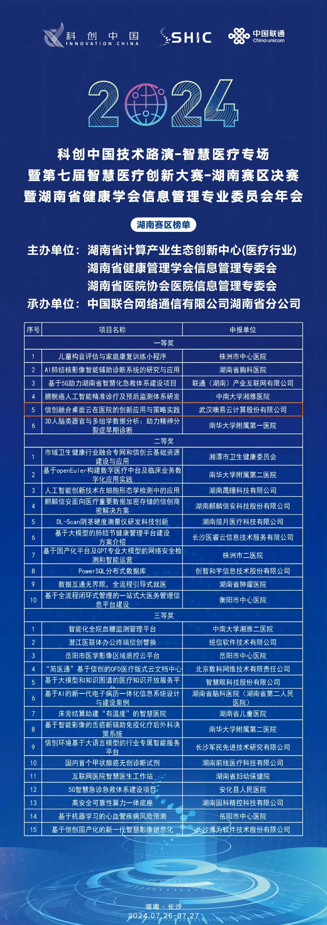 7月26日至27日,科创中国技术路演-智慧医疗专场暨第七届智慧医疗创新大赛-湖南赛区决赛暨湖南省健康管理学会信息管理专委会年会在长沙举行。大会由湖南省计算产业生态创新中心(医疗行业)、湖南省健康管理学会信息管理专委会、湖南省医院协会医院信息管理专委会联合主办,参赛的32个项目来自湖南省、市、县区各个类别的医疗相关机构,涵盖应用创新、技术创新、医信创新、基层创新等类型。经过近8个小时的评审、提问、打分,最终产生一等奖6名,二等奖10名,三等奖15名。