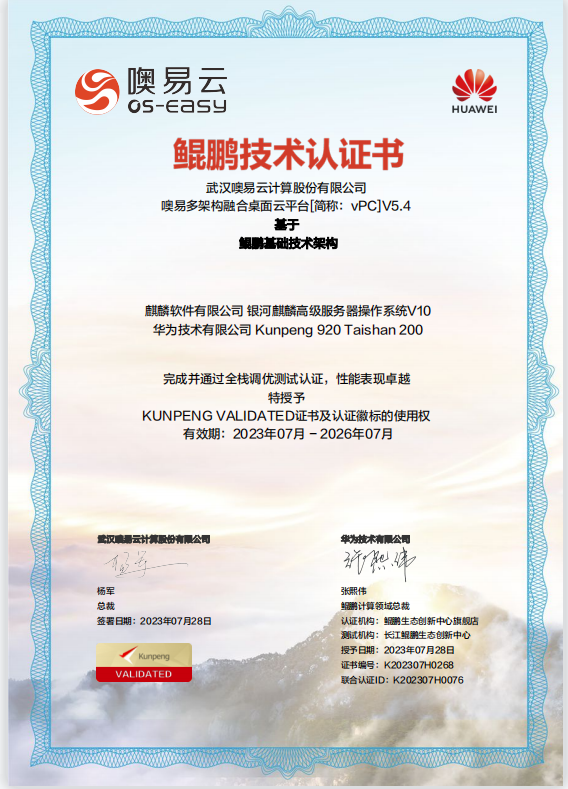 近日,由武汉 噢易云计算股份有限公司自主研发的噢易多架构 融合桌面云平台凭借高效安全稳定的运行结果和出色的兼容性,完成并通过了华为技术有限公司 Kunpeng 920 Taishan 200相互兼容性测试认证,以及基于鲲鹏基础技术架构的全栈调优测试认证。