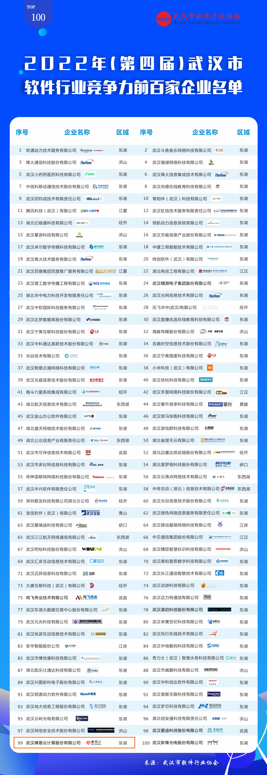 2022年武汉市软件百强企业榜单