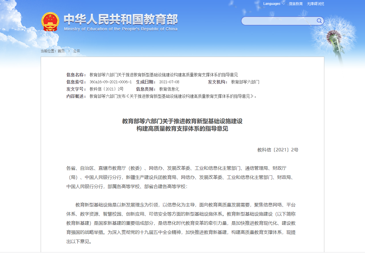 随着教育部等六部门印发《关于推进教育新型基础设施建设构建高质量教育支撑体系的指导意见》,明确提出到2025年,基本形成结构优化、集约高效、安全可靠的教育新型基础设施体系的指标。