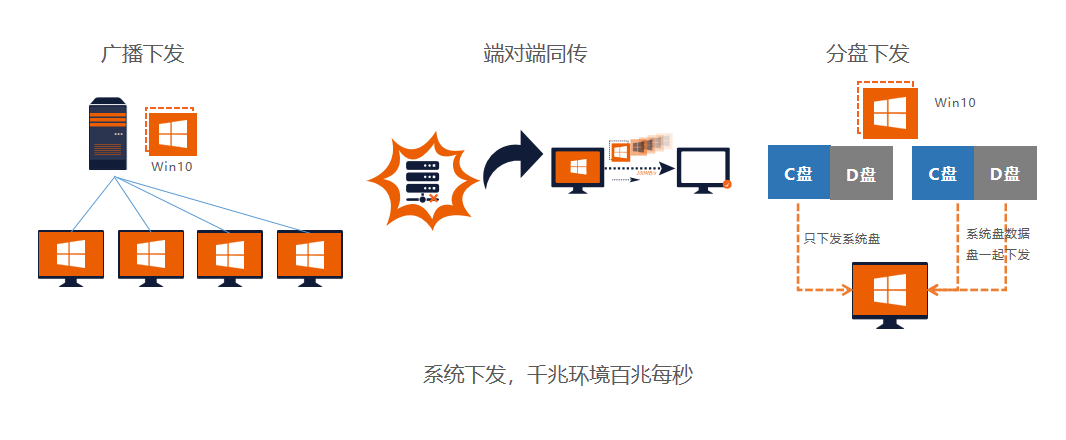 面对复杂的网络环境,提供广播下发、端对端同传、分盘下发等多种下发方式,千兆网络环境下,系统下发速度可达100MB/s。