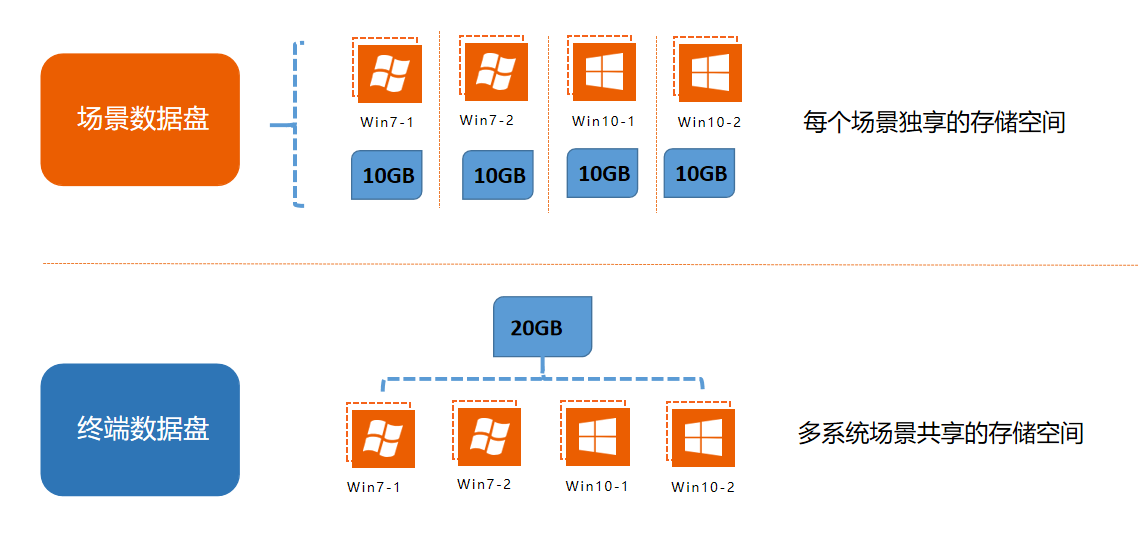 场景数据盘和终端数据盘用于存放用户需要放置在VOI终端上留存的数据。场景数据盘专属于某一VOI桌面专用,终端数据盘可被终端上所有VOI桌面共用,灵活满足不同终端数据存放需求。