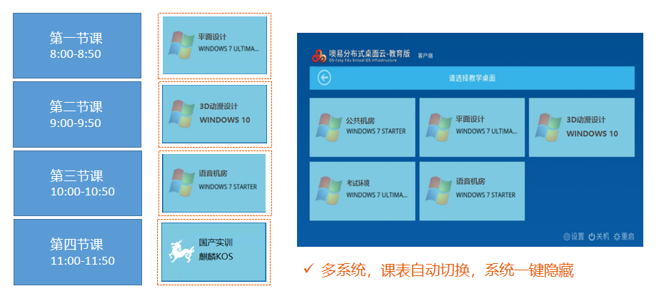 一个终端可承载多个桌面操作系统,提供系统选单,不同专业上课时进入不同教学桌面,也可根据课表时间自动进入对应桌面系统,单机房多功能用途,满足不同专业教学、考试、自主学习等需求。