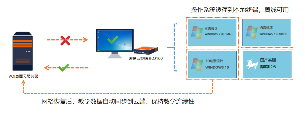 多操作系统可缓存到本地,当服务器离线时,教学桌面继续使用,网络恢复后,教学数据自动同步到云端,保持教学连续性。
