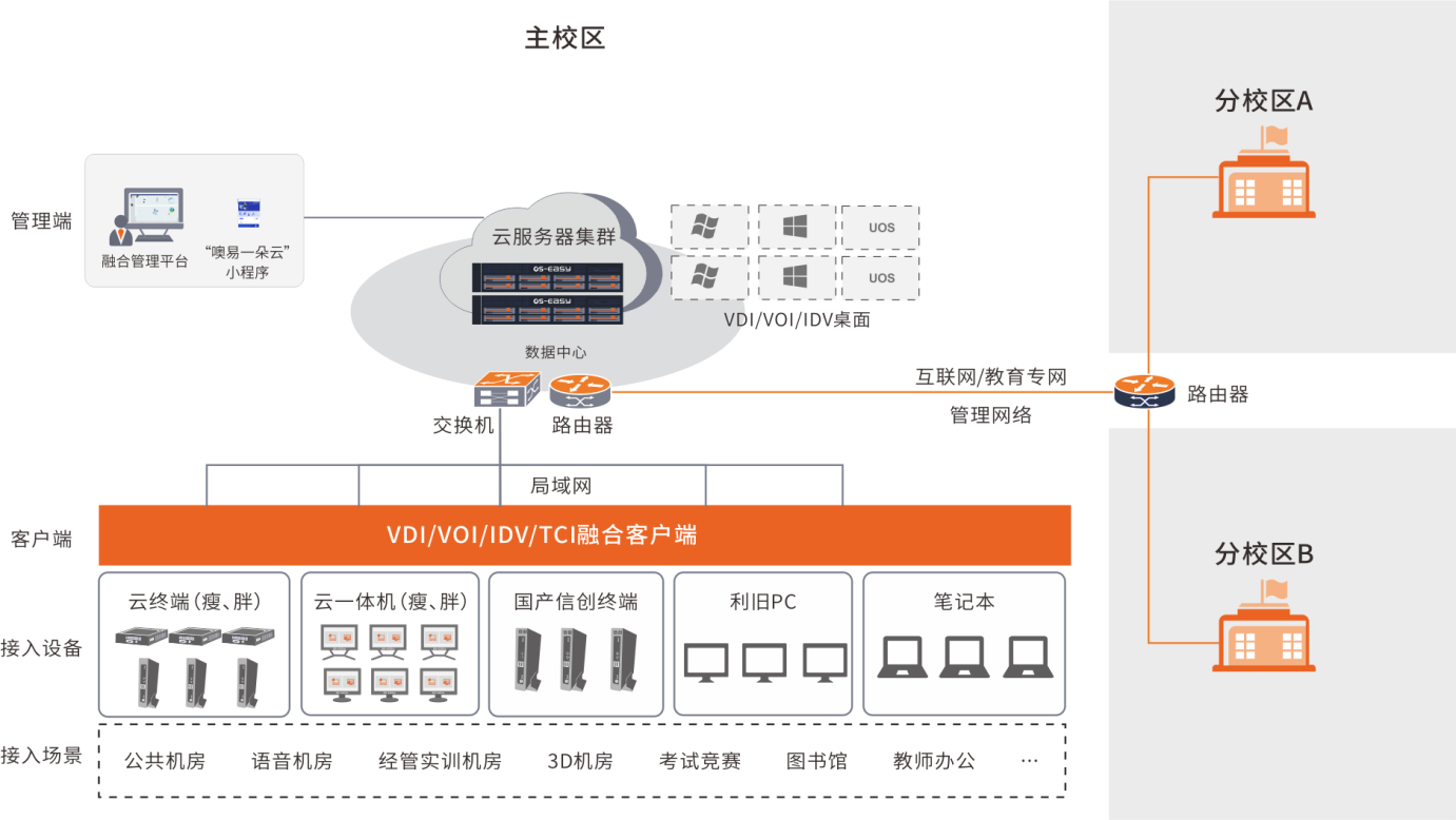 | 数据中心 | 云服务器组资源集群,通过融合桌面云平台提供云桌面服务,覆盖所有应用场景,分校区可共享主校区云服务器资源,也可自建服务器,纳入平台实现跨校区统一管理 |