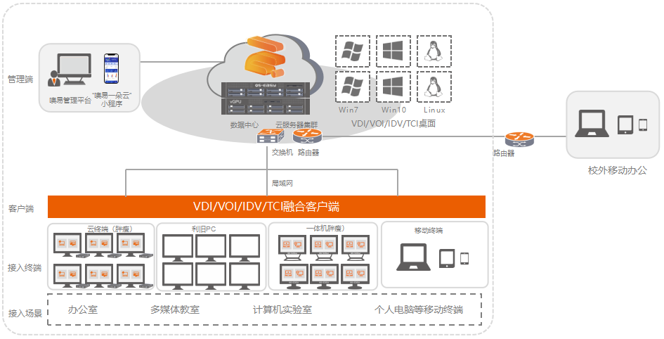 以云桌面技术为核心,通过融合VDI、VOI、IDV和TCI等多种架构,为教师打造了一个高效、灵活、稳定的办公环境。