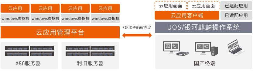 噢易云应用运行与国产设备上,提供丰富的应用列表,平台通过虚拟化技术统一调度实现应用生态的融合。