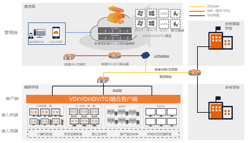 面向全区全县不同学校教学使用场景需求,交付不同桌面架构的教学环境,覆盖学校电脑教室、多媒体教室、备课室、实验实训室、教师办公等应用场景,促进现代信息技术与基础教育的深度融合。单一的融合管理平台,集中的管理和运维方式,让教学更顺畅,学习更高效,管理更轻松。