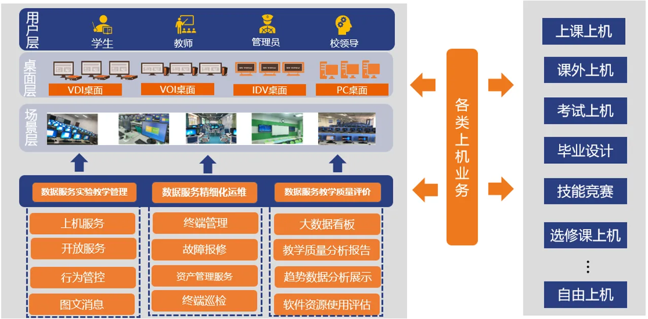 面向高校机房管理部门客户(如实训中心、信息中心),提供上机管理(如登录认证、风险预警、行为管控、报修)、终端资产监控、软件/教学资源使用统计、数据信息展示服务等功能。