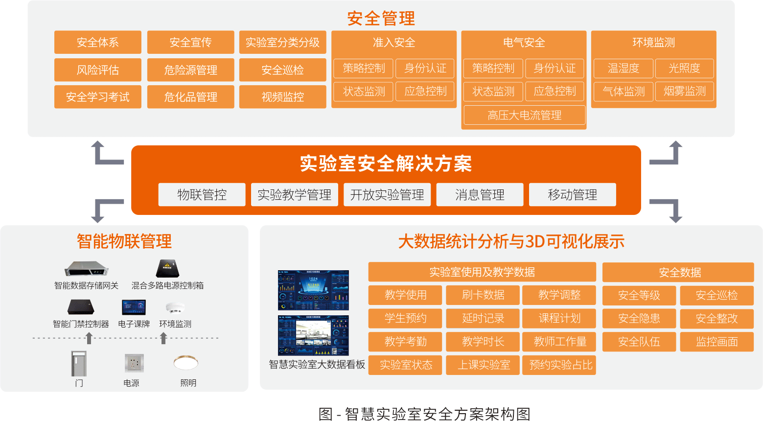 物联网技术、数字视频技术、现代化信息技术与大数据分析相结合,建立一套软硬件相结合、流程完善、过程节点可防可控、并提供事后溯源的安全管理与防控体系,同时利用信息化技术和大数据分析功能为实验室提供相应的报警、预警安全信息,有效降低实验室安全风险。