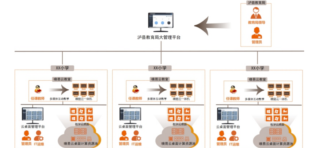 四川省泸州市泸县教育局,响应国家信息化建设号召,经研究讨论后决定采用云桌面的建设模式,满足教育局管辖范围内学校的教学使用,降低学校的管理运维难度,有助于改进薄弱学校信息化建设,让学生教学环境与高教实现接轨。因此对19所学校进行了云桌面建设,让虚拟化技术融入校园生活。