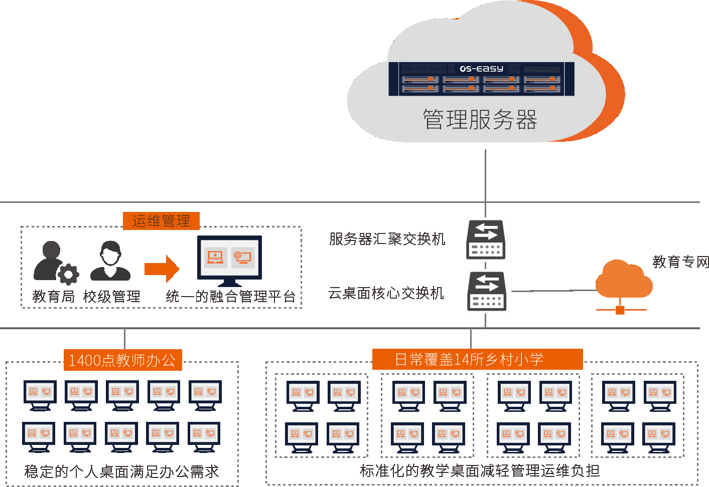 当前办公终端分布零散,电脑使用年限太久经常出现各种故障,信息技术老师无法迅速及时处理故障,导致教师办公无法正常进行。同时电脑数量多,导致信息技术老师运维难度高。