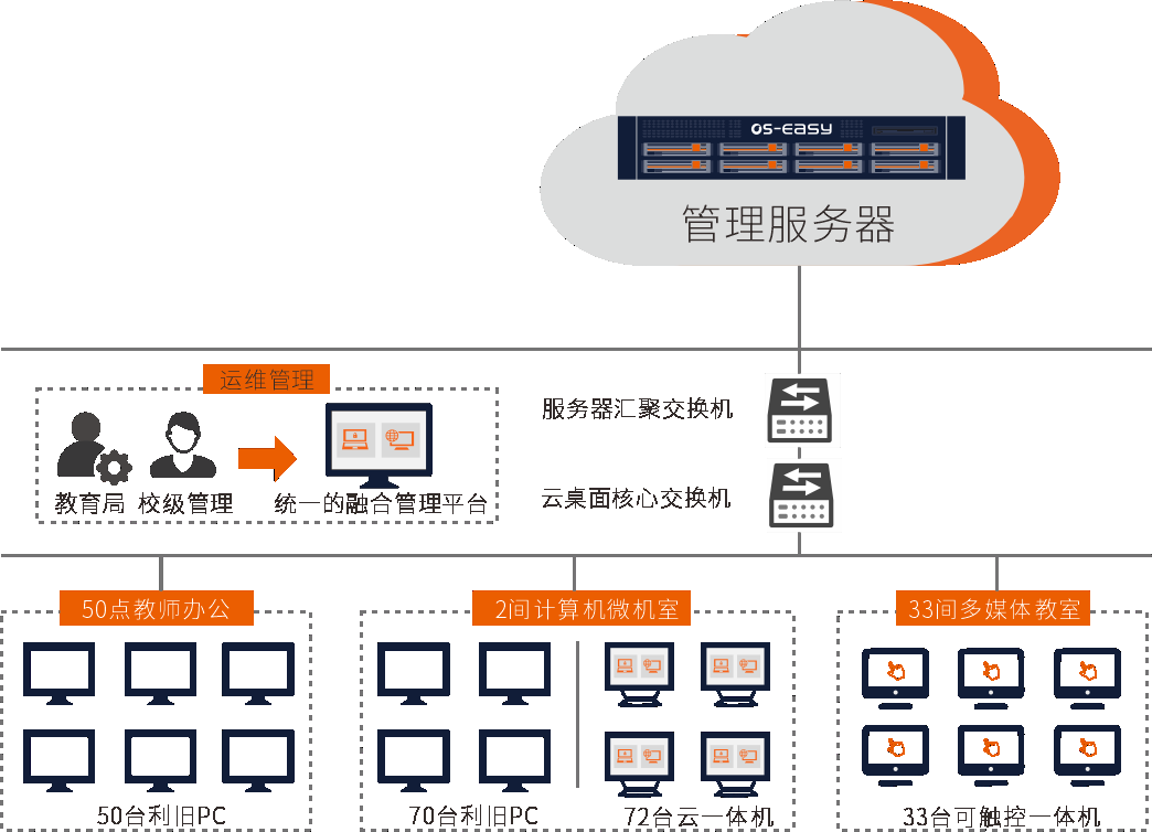 学校机房共有33台希沃可触控一体机、244台异构PC,分布在不同楼层和不同教室,管理老师的日常运维压力大,工作耗时耗力。
