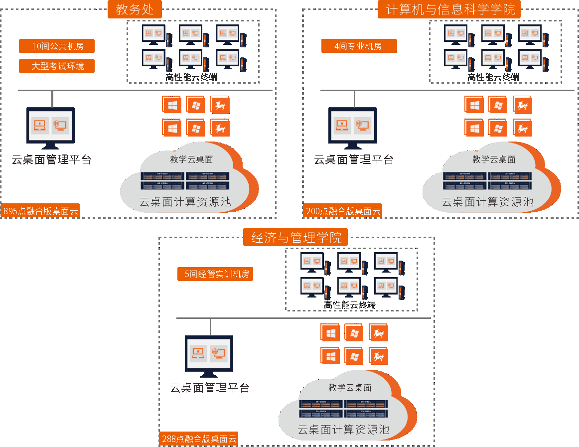 经济与管理学院部署288点融合桌面云分布于5间经管专业机房,部署VDI架构云桌面,采用“SSD HDD”混合设计方式,利用SSD硬盘的高读写能力提供内存加速技术,提升系统整体I/O性能,保障用户批量创建账套的速度,提升授课老师在教学过程中的教学质量和授课效率。