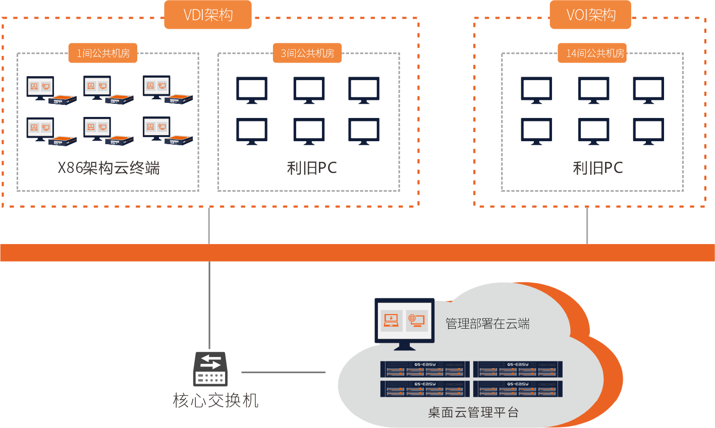 通过单一的融合管理平台交付VDI、VOI架构的云桌面系统,满足多元化教学和个人化需求,实现4间VDI机房和14间VOI机房、设备、桌面的统一部署、管理和运维。