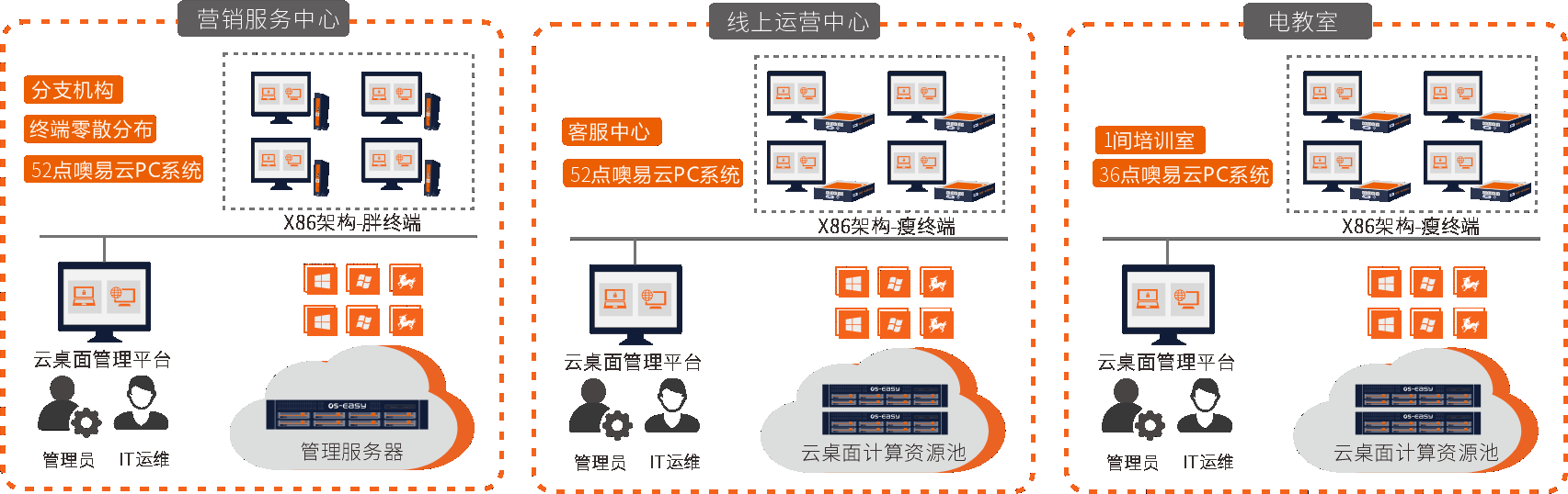 噢易云PC系统针对营销服务中心终端位置分散、网络不稳定等情况,交付VOI架构桌面云,实现大规模分散终端的统一管理和维护;针对线上运营中心人员流动大、业务需要灵活拓展等情况,交付VDI架构桌面,当业务扩张或新增坐席时,只需增加云终端设备,即可实现桌面的扩容;针对参与培训人员流动复杂、缺失学习兴趣、课堂纪律意识差等情况,交付VDI架构桌面,实现标准化教学环境的统一交付,同时还可对培训人员桌面行为进行管控,有效提高教学质量、规范教学秩序。