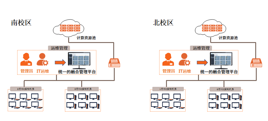 广州市轻工技师学院共建设256点VDI架构桌面云、289点VOI架构桌面云,五期建设实现不同架构的桌面云统一、远程的管理与运维;解决大规模、复杂、混合场景分批建设,统一管理的问题,打造一站式服务管理平台。