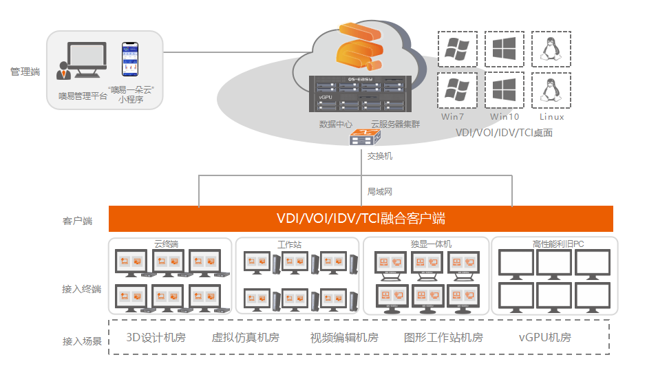 噢易桌面云系统提供智能PNP驱动技术,可实现对不同批次不同配置的异购终端系统的兼容,支持对终端异构计算机进行统一管理,一个操作系统镜像可适用所有不同类型的PC更新一个镜像,便可达到更新全部终端的目的,大大降低管理维护工作,提升管理效率。