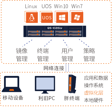 一些用户会有疑问:IDV能跑早期操作系统,VOI可以吗?并不一定。如果前端的电脑本身能装载win7,那么VOI在这台电脑上就能支持win7,但如果单机无法装载win7,那么VOI也推不了。但是IDV能。换言之,VOI会受制于前端的硬件本身对操作系统的兼容性,而IDV不受其限制。