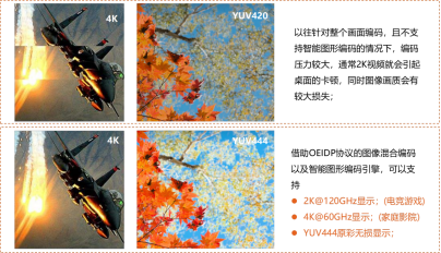 该技术的突破点首先是它能够准确地动态识别画面内容区域,并将其按照视频、图像、文字进行区分。其次是OEIDP图像混合编码技术能够根据视频、图像、文字,有针对性地采用专属的图像处理方式进行编码,减少传输时数据量。