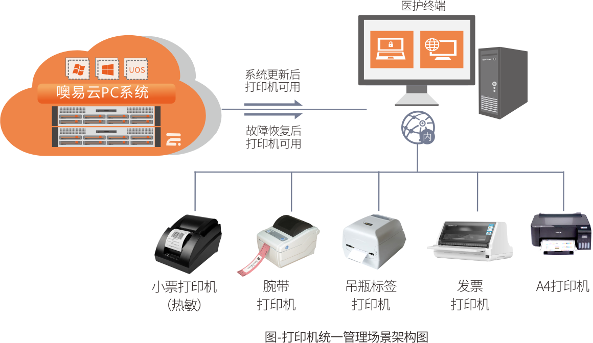 在系统每次更新后或系统故障重置修复后,无论是胖终端还是瘦终端,打印机都能自动获取对应的驱动和配置,不影响打印机正常使用