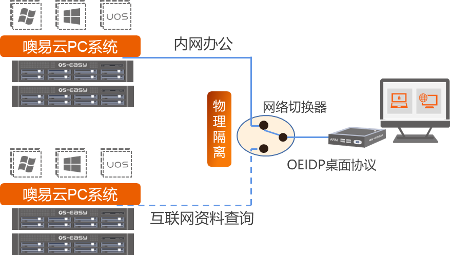 内外网桌面严格按照物理网络隔离,10s即可完成桌面切换,保持使用习惯不变