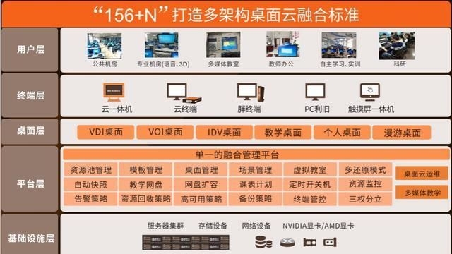 云融合版,该技术融合了 VDI/VOI/IDV 三种桌面技术架构,是业内唯一实现 5 个层次融合的桌面云技术。