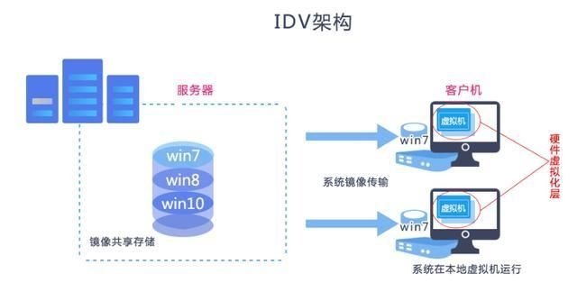 针对VDI的先天缺陷,英特尔提出了IDV概念----智能桌面虚拟化(Intelligent Desktop Virtualization,IDV),采用集中存储、分布运算的构架,他虚拟桌面的运行赶回了终端的本地电脑上运行,系统镜像统一存放到服务器端,配置并下发到终端机器硬盘上,终端通过虚拟机运行桌面,不再对网络过度依赖,无需大量的图像传输,支持系统离线运行,同样可以统一管理终端桌面系统,虽然相对VDI有个很大改善,但是要求本地硬件必须统一,必须支持VT等带外特性,另外由于没有脱离虚拟机概念,性能和兼容性还是没有办法和传统的PC机器相比。