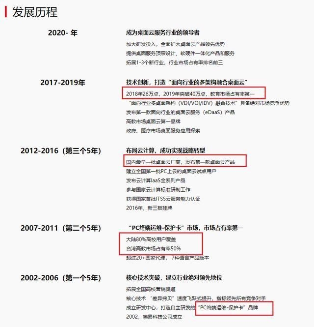 然后从2012年与时俱进,转型桌面云,依然是服务高校。因为有以前的深厚积累,很快就在教育市场打开了居民,在2019年桌面云的教育市场做到了第一。
