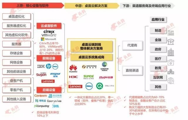 桌面云产业链上游环节提供核心软件及硬件设备,包括前端的存储设备、服务器、网络设备,后端的瘦客户机端或其他任何与网络相连的终端设备,以及实现桌面虚拟化的软件。中游参与者为桌面云解决方案提供商,为用户提供一体化服务。下游渠道包括直销与代理渠道,行业用户囊括制造、金融、政府、医疗、教育、互联网等行业企业。