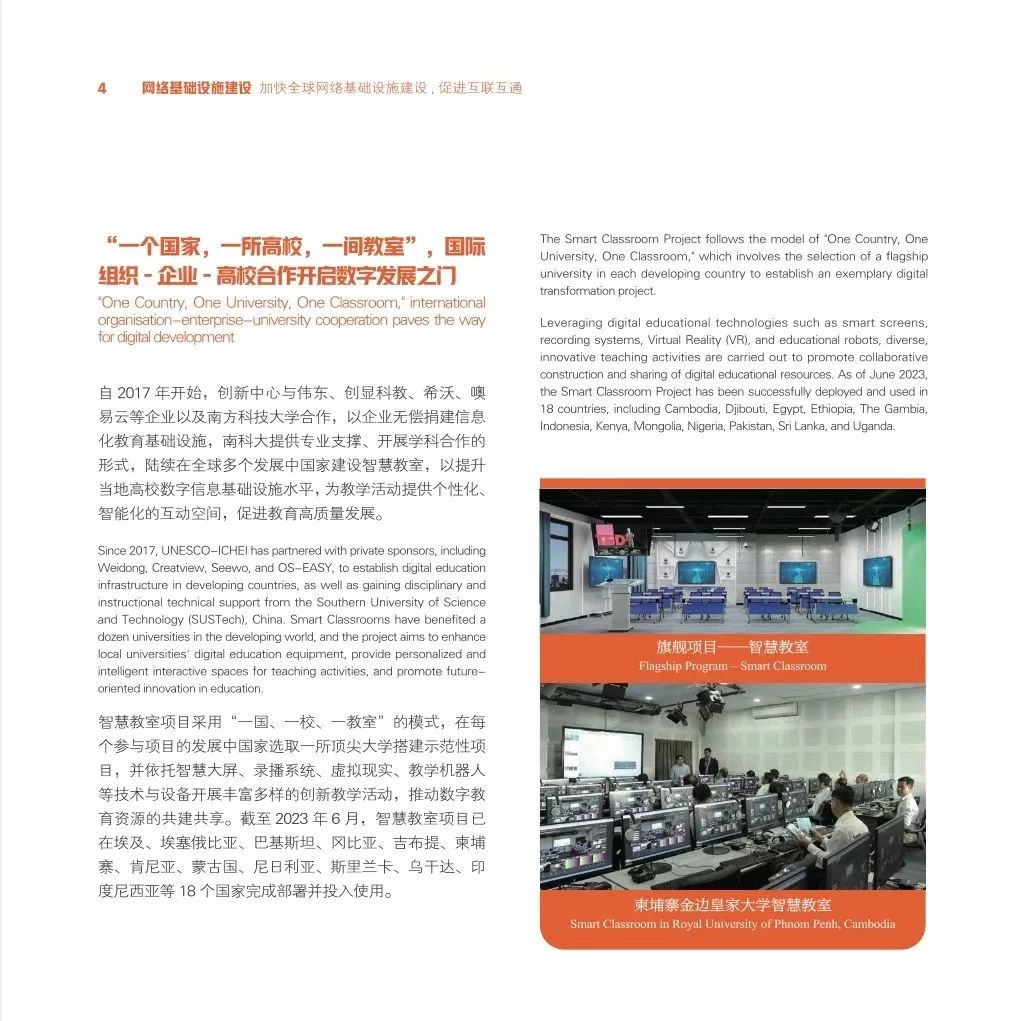 作为世界互联网大会乌镇峰会的重要活动,自2021年起,世界互联网大会每年组织开展“携手构建网络空间命运共同体”实践案例征集,获得各方主体的广泛参与。中国国家互联网信息办公室主任、世界互联网大会理事长庄荣文,世界互联网大会副理事长弗朗西斯·高锐,中国国家互联网信息办公室副主任王崧,世界互联网大会秘书长任贤良,浙江省人民政府副省长柯吉欣出席活动并颁发纪念奖杯、纪念证书。 唐湘政在大会中作以“智慧教室——产教融合构建网络空间学习共同体”为题的主旨发言。他指出数字基础设施建设是弥合发展中国家数字鸿沟的关键。创新中心通过与教育技术龙头企业合作,与一带一路沿线发展中国家伙伴院校共同推出智慧教室项目,借助中国企业在教育领域的先进经验,惠及全球。 自2017年以来,创新中心与 噢易云等4家企业携手,以企业捐建设施、南方科技大学提供专业支撑的形式,在亚非共计规划了40间智慧教室,其中12个国家的智慧教室已完成部署并进入日常运营。噢易云作为国际网络教育学院(IIOE)企业合作伙伴在智慧教室、ICTE微认证、课程资源共享等领域发力,有效赋能全球教师数字教学能力提升、助力高校人才培养能力提升。