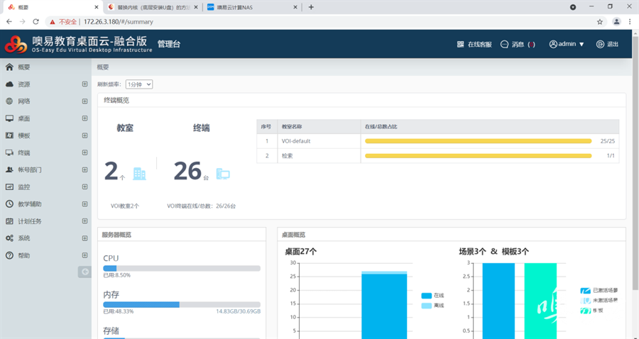 针对分散的检索机和培训室内的电脑终端,管理员通过部署噢易融合桌面云替代传统PC的管理方式。在千兆网络的环境下,云桌面镜像下发速度可达100MB/s,每分钟接受速度可达6GB。云桌面系统采用磁盘差异化更新技术,实现快速更新系统补丁和软件,为读者提供更流畅、更方便的使用体验。