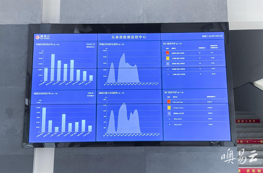 针对学生上机过程的监管,了解学习效果,噢易云也给予了完备的解决方案。在湄洲湾职业技术学院的实验楼大厅部署一台100寸LED大屏,接入桌面云平台管理系统,通过对接内部数据库信息,在大屏上显示计算机机房实时动态数据、资源总体概况、教室服务数据、终端服务数据、桌面服务数据、软件服务数据、趋势数据等,以数字化赋能实验教学管理。