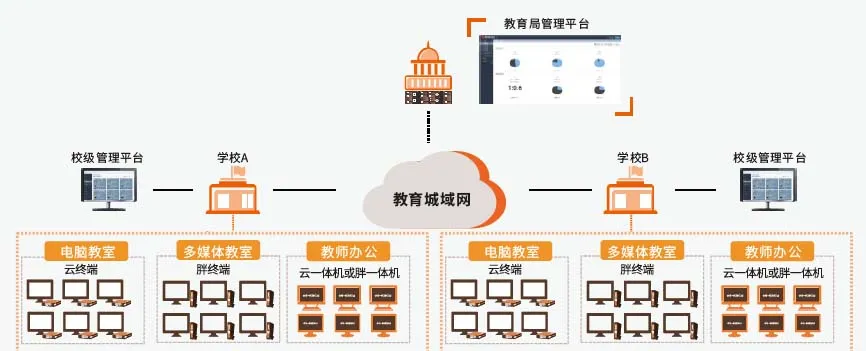 宜昌市夷陵区教育局平台为区域级云桌面平台,云服务器部署在教育局,教育局可通过单一IP地址访问和管理20多中小学校,学校可通过个人账号管理自己的校区,满足教育局区域云桌面建设。支持跨学校多区域资源汇总分析,便于教育局 握各校云 教室使用 占比、 教学应用 情况、 桌面使 用数据 ,为信息化教学分析提供数据 参考。   区校一体化云教室解决方案架构(图) 机房管理和维护(图)